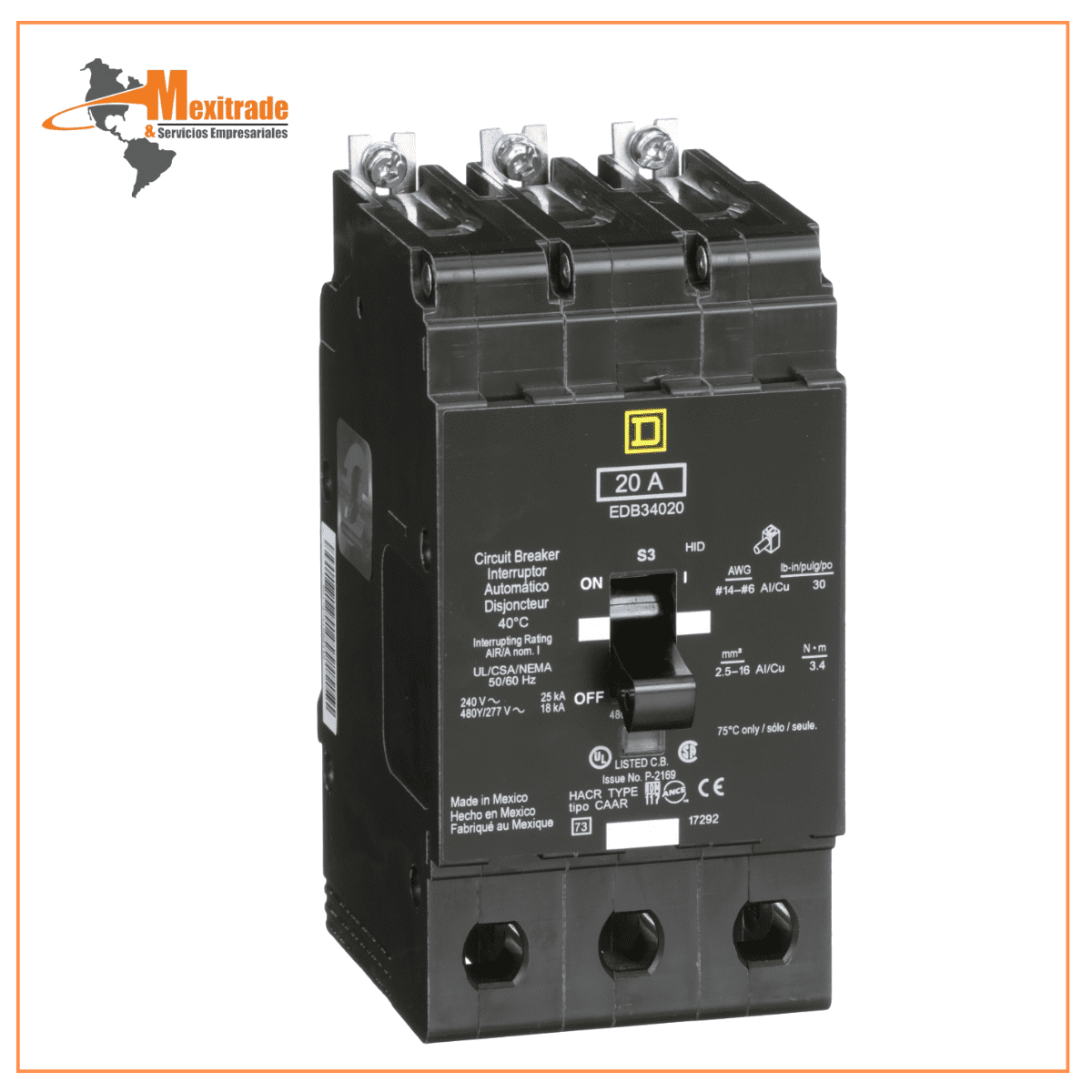 Interruptor mini atornillable marco E Square D de 3 Polos, 20A, 480Y/277 VCA y 18/25kA